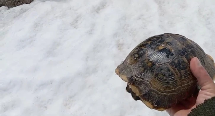 Hakkâri’nin Bağışlı köyünde yaşayan Davut Kaya isimli vatandaş, dağda mantar aradığı sırada, kar üzerinde sırt üstü mahsur kalan kaplumbağayı kurtardı.