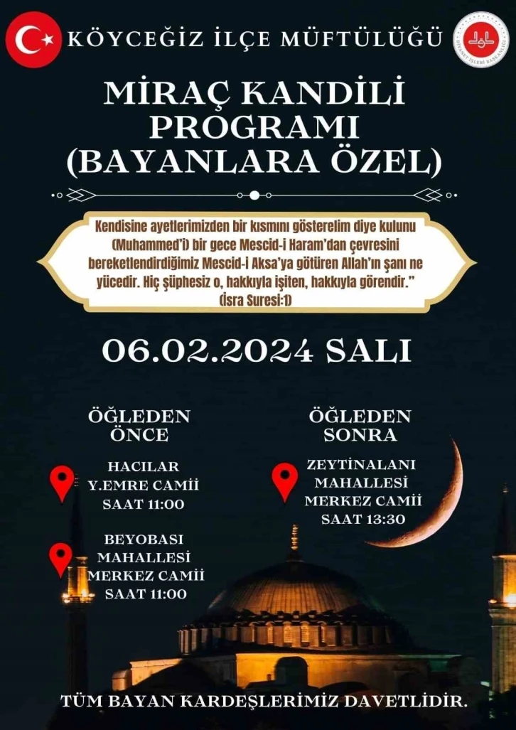 Muğla’nın Köyceğiz ilçesinde Miraç Kandili nedeniyle özel programlar düzenlenecek. 6 Şubat 2024 Salı gününü Çarşambaya bağlayan gece Müslümanlar için kutsal sayılan Miraç Kandili idrak edilecek. Köyceğiz’de Miraç Kandili vesilesiyle başta depremde hayatını kaybeden vatandaşlar ile tüm şehitler için dualarda bulunulacak. 6 Şubat 2024 Salı günü gündüz Beyobası Merkez Camii, Hacılar Yunus Emre Camii ile Zeytinalanı Merkez Camiinde bayanlara yönelik, akşam namazından sonra da Köyceğiz’deki tüm camilerde olduğu gibi Köyceğiz Merkez Hacıbey Camiinde Kandil özel programı gerçekleştirilecek. Köyceğiz İlçe Müftüsü Ahmet Karagöz, “Programlarımıza tüm halkımızı davet eder, Köyceğizli kardeşlerimizin, misafirlerimizin ve tüm inananların; dileklerin dalga dalga Cenab-ı Allah’a ulaştığı, dökülen pişmanlık gözyaşlarının günahları silip yok ettiği Miraç kandillerini tebrik eder, yapacağımız dua ve niyazların kabul görmesini, İslam Aleminin, birlik ve beraberliğine, Aziz Milletimizin ve bütün insanlığın barış, huzur ve saadetine vesile olmasını Yüce Allah’tan temenni ve niyaz ederim" dedi.