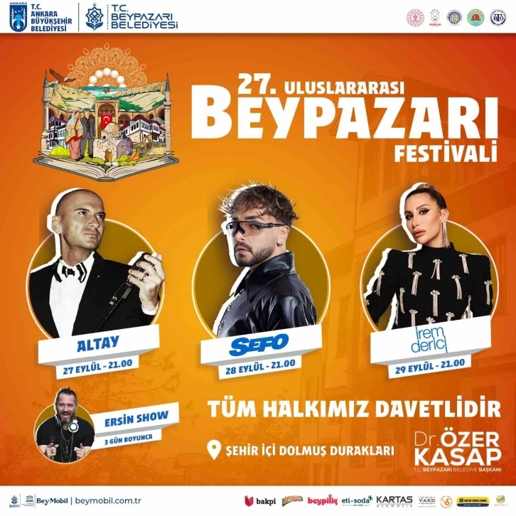 Ankara’nın Beypazarı ilçesinin kültürel öğelerini barındıran 27. Uluslararası Beypazarı Festivali, 27-29 Eylül tarihleri arasında gerçekleştirilecek. 3 gün sürecek olan festivalin ilk gününde vatandaşlara Ahilik pilavı ikram edilerek, kentin farklı noktalarında animasyon ekipleri gösteriler düzenleyecek. Seğmen folklor gruplarının sokak sokak gösteri yapacağı festivalde dev Türk bayraklarıyla da kortej düzenlenecek. Paramotor ile gökyüzünde Türk bayrağı gösterisi yapılacak. İlk günkü etkinlikler Mehmet Altay Biber’in konseri ile tamamlanacak.