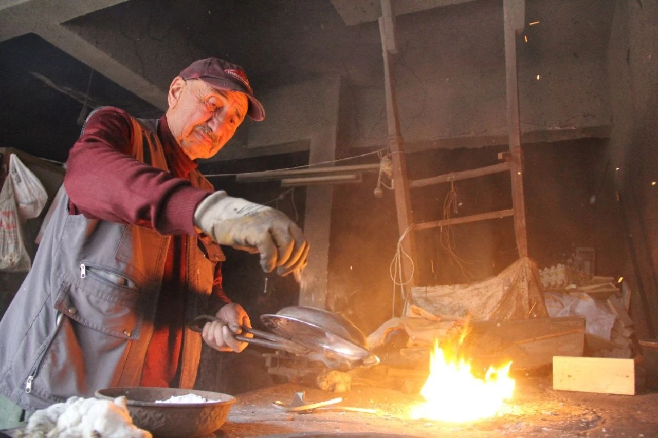 Çorum’un Alaca ilçesinde kalaycılık mesleğinin son temsilcilerinden olan 76 yaşındaki Salih Dokuz, 69 yıllık mesleğini ilk günkü aşkla yapıyor.