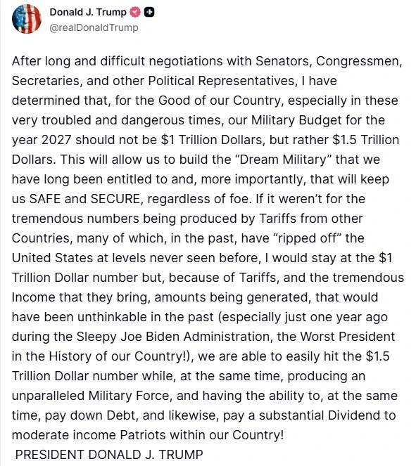 ABD Başkanı Donald Trump, ülkesini çevreleyen zorlu güvenlik ortamına dikkat çekerek, "Senatörler, Kongre üyeleri, bakanlar ve diğer siyasi temsilcilerle yapılan uzun ve zorlu müzakerelerin ardından, özellikle bu son derece çalkantılı ve tehlikeli dönemde ülkemizin yararı için, 2027 yılı askerî bütçemizin 1 trilyon dolar değil 1 buçuk trilyon dolar olması gerektiğine karar verdim" açıklamasında bulundu.