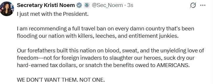 ABD İç Güvenlik Bakanı Kristi Noem, ABD Başkanı Donald Trump ile bir görüşme gerçekleştirdiğini belirterek, "Ülkemizi katiller, sülükler ve her şeye hakkı olduğunu sanan bağımlılarla dolduran her lanet ülkeye tam seyahat yasağı uygulanmasını öneriyorum" açıklamasında bulundu.