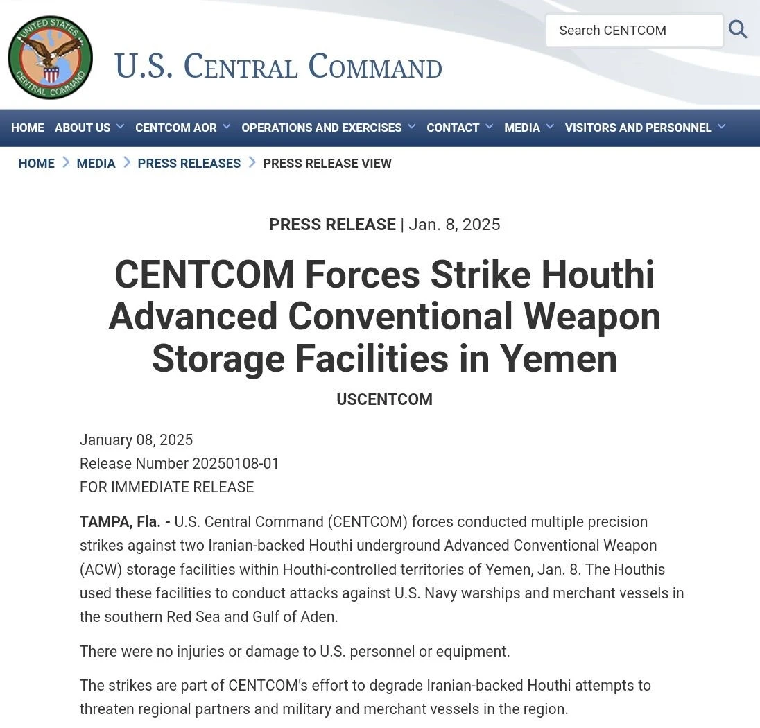 ABD Merkez Kuvvetler Komutanlığı (CENTCOM), Yemen’deki İran destekli Husilere ait yeraltı silah depolarına hassas saldırılar düzenlendiğini açıkladı. Son saldırıların, “CENTCOM’un İran destekli Husilerin ABD’nin bölgesel ortakları ve bölgedeki askeri ve ticari gemileri tehdit etme girişimlerini engelleme çabalarının bir parçası olduğu” ifade edildi.