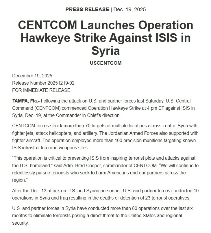 CENTCOM Komutanı Amiral Brad Cooper, Suriye’deki DEAŞ unsurlarını hedef alan son operasyonun DEAŞ’ın ABD’ye yönelik terörist planlarını ve saldırılarını önleme konusunda kritik öneme sahip olduğunu vurgulayarak, "Amerikalıları ve bölgedeki ortaklarımıza zarar vermek isteyen teröristleri amansızca takip etmeye devam edeceğiz" açıklamasında bulundu. Trump, Suriye’deki DEAŞ unsurlarına misilleme operasyonunu duyurmuştu