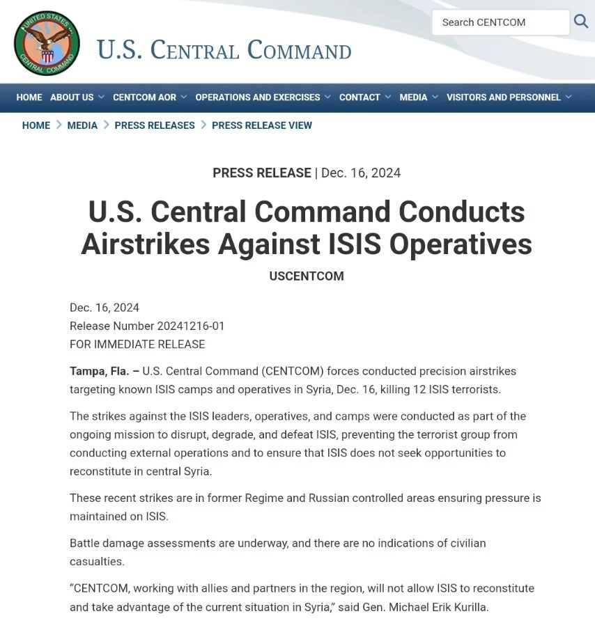 ABD Merkez Kuvvetler Komutanlığı (CENTCOM), Suriye’deki DEAŞ hedeflerine yönelik hassas hava saldırıları gerçekleştirildiğini açıkladı. Daha önceden Esad rejimi ve Rusya’nın kontrolünde olan bölgeleri hedef alan saldırılarda 12 DEAŞ’lı teröristin öldürüldüğü bildirildi. Saldırıların DEAŞ’ın Suriye’de yeniden yapılanmasını önlemeyi ve DEAŞ üzerindeki baskıyı sürdürmeyi amaçladığı kaydedilirken, ilk belirlemelere göre sivil kayıp yaşanmadığı aktarıldı. CENTCOM Komutanı General Michael Erik Kurilla ise, saldırılarla ilgili olarak "Bölgedeki müttefikler ve ortaklarla birlikte çalışan CENTCOM, DEAŞ’ın yeniden yapılanmasına ve Suriye’deki mevcut durumdan yararlanmasına izin vermeyecek" açıklamasında bulundu.