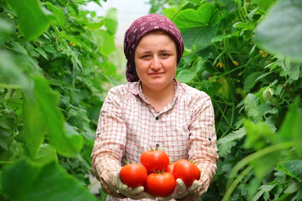 Kahramanmaraş’ta Kadıoğlu Çiftliği Mahallesi’nde dört mevsim örtü altında yerli domates üretimi yapılıyor.