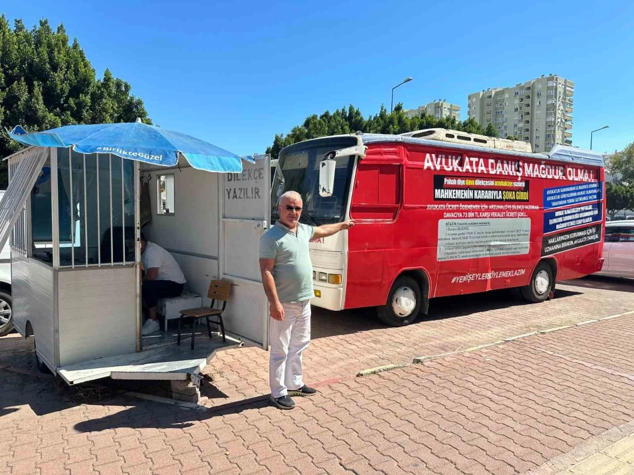 Antalya Adliyesinin karşısındaki park alanına konulan ve üzerinde arzuhalcileri eleştiren yazıların bulunduğu otobüs, arzuhalcileri kızdırdı. ‘Avukata danış, mağdur olma’ yazısının altına, ‘pahalı diye dava dilekçesini arzuhalciye yazdırdı, mahkemenin kararıyla şoka girdi’ başlığının bulunduğu bir haberi paylaşan ve altına da mahkeme kararını koyan kimliği belirsiz başkan adayı, arzuhalcileri kızdırdı.
