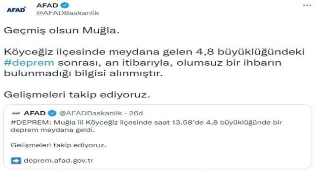 Yaşanan depremin ardından AFAD’tan yapılan açıklamada, “Geçmiş olsun Muğla. Köyceğiz ilçesinde meydana gelen 4,8 büyüklüğündeki deprem sonrası, an itibariyle olumsuz bir ihbarın bulunmadığı bilgisi alınmıştır. Gelişmeleri takip ediyoruz” ifadeleri yer aldı.