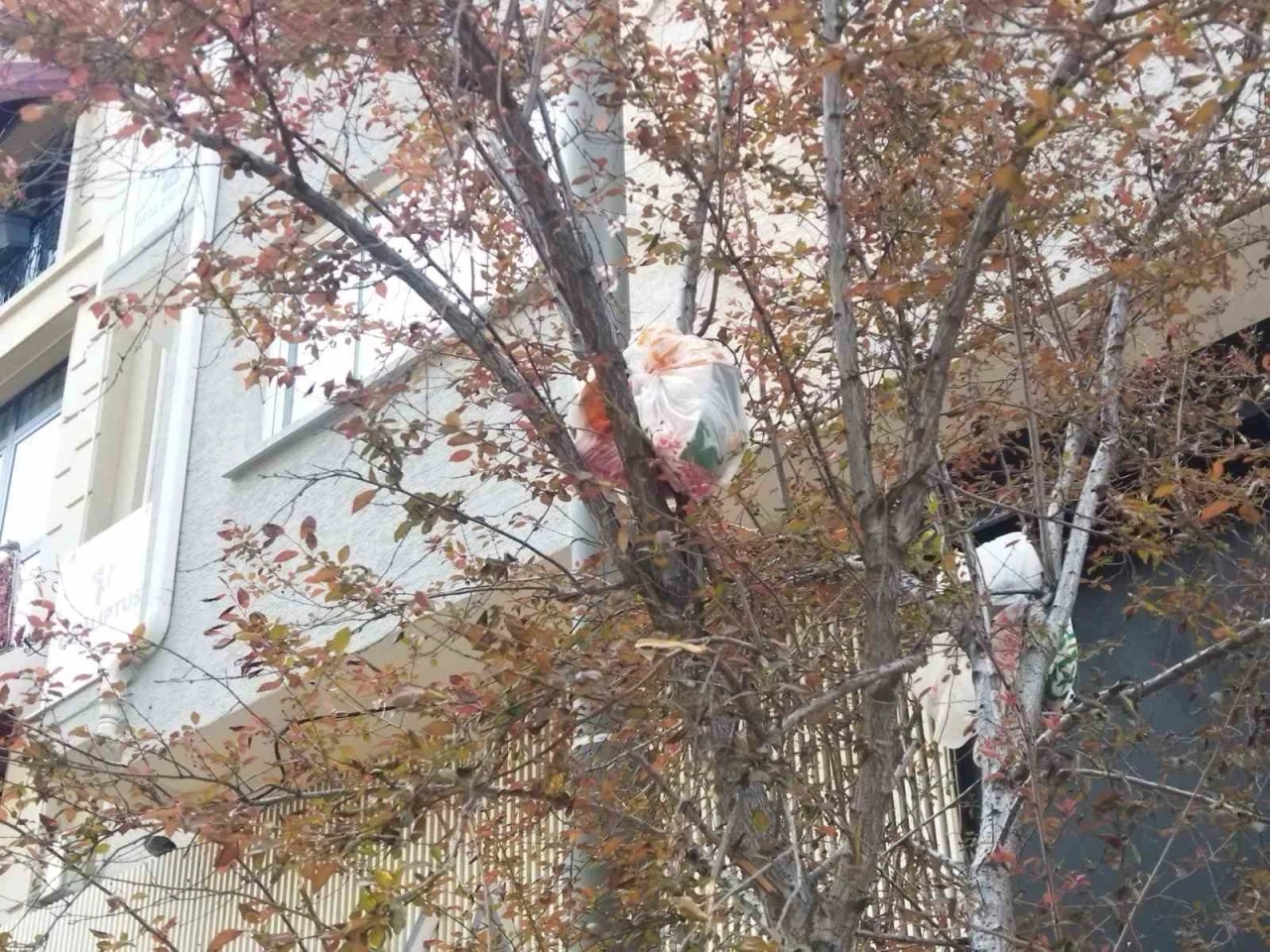 Eskişehir’deki bir cadde kenarındaki ağacın dallarında gözüken içi çöp dolu poşetler ilginçliğin yanı sıra kötü bir görüntü oluşturdu.