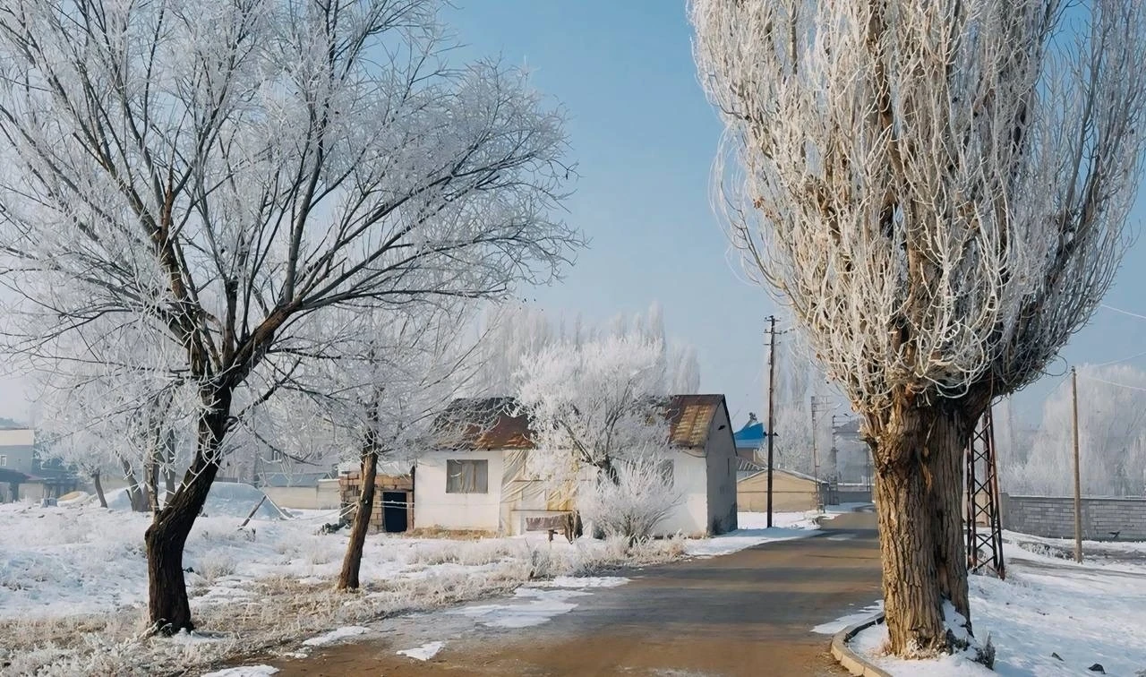Ağrı’da soğuk hava nedeniyle ağaçlar ve bitkiler kırağı tuttu, evlerin çatılarında metrelerce buz sarkıtları oluştu.