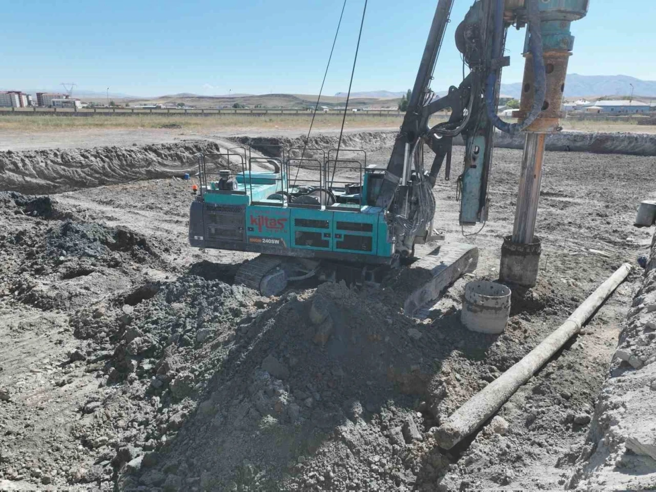 Ağrı İl Özel İdaresi tarafından yapımına başlanan yeni hizmet binasında temel kazısı tamamlanırken, zemin iyileştirme çalışmaları fore kazık uygulamasıyla sürüyor.