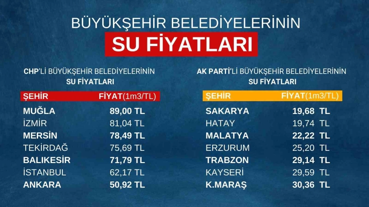 Özcan, AK Partili belediyeler ile CHP’li belediyeler arasında özellikle su fiyatlarında ciddi farklılıklar gözlendiğini söyledi. Özcan, AK Partili Sakarya Büyükşehir Belediyesi’nde suyun metreküp başına 19,68 liradan sunulmasına rağmen CHP’li Muğla Büyükşehir Belediyesi’nde aynı hizmetin 89 liraya satılmasını örnek gösterdi. Özcan, "Bu oran, vatandaşlarımızın yaşam kalitesinde ciddi düşüşe neden oluyor. Su, yaşamın vazgeçilmez kaynağı olmasına rağmen bu fiyat farkı büyük bir ekonomik adaletsizliği ortaya koyuyor" diye konuştu.