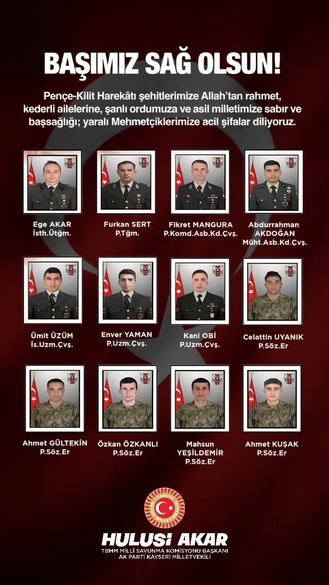 AK Parti Kayseri Milletvekili ve TBMM Milli Savunma Komisyonu Başkanı Hulusi Akar; Pençe Kilit Harekatı bölgesinde şehit olan 12 asker için başsağlığı mesajı yayımladı.
