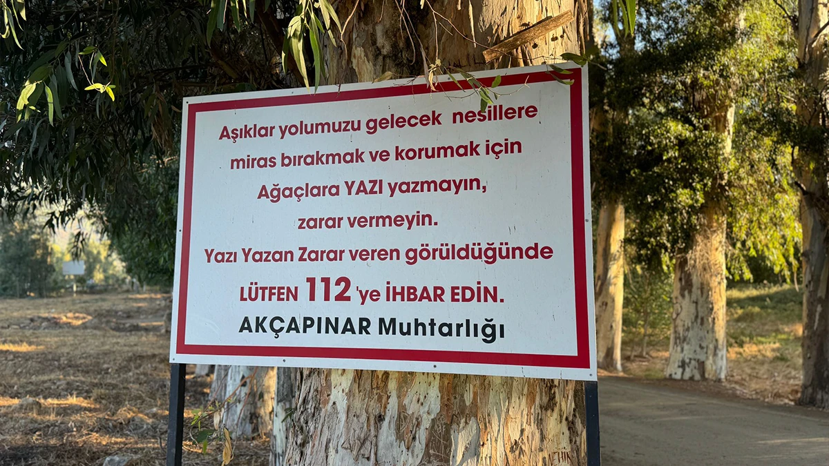 Tabelada, “Aşıklar yolumuzu gelecek nesillere miras bırakmak ve korumak için ağaçlara yazı yazmayın, zarar vermeyin. Yazı yazan veya zarar veren görüldüğünde lütfen 112’ye ihbar edin” ifadeleri yer aldı.