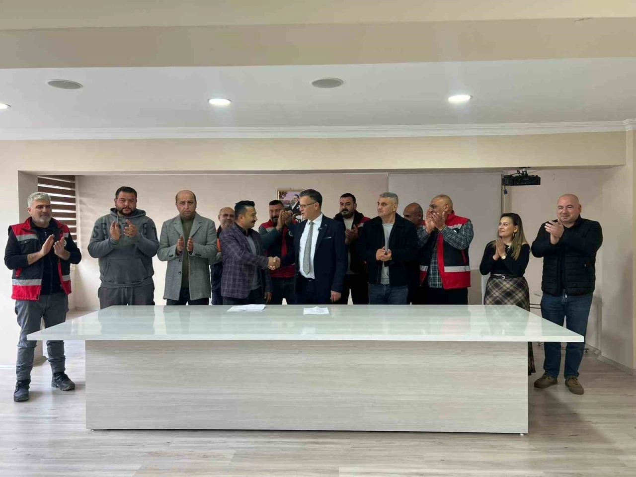 Alaşehir Belediye Başkanı Ahmet Öküzcüoğlu, Belediye-İş Sendikası Temsilcisi Devrim Dinçer ve belediye çalışanlarının katılımıyla düzenlenen toplantıda 2026 yılı maaş zamları kamuoyuyla paylaşıldı. Geçtiğimiz yıl imzalanan toplu iş sözleşmesi kapsamında, 2026 yılı için zam oranı enflasyon artı 5 puan olarak uygulanırken, toplam 417 belediye çalışanı yapılan artıştan yararlandı.