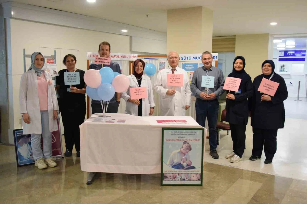 Düzce Üniversitesi Tıp Fakültesi Hastanesi’nde 1-7 Ekim Emzirme Haftası dolayısıyla farkındalık standı kuruldu. Yenidoğan hemşireleri tarafından açılan stantta anne ve anne adaylarına emzirme teknikleri, emzirme pozisyonları, süt üretimini artırma yöntemleri ve anne sütünün bebekler için faydaları hakkında bilgilendirici broşürler dağıtıldı. Başhekim Prof. Dr. Muhammet Ali Kayıkçı, Başhekim Yardımcısı ve Başmüdür Dr. Öğr. Üyesi Mehmet Fuat Çetin, Başhekim Yardımcısı Dr. Öğr. Üyesi Şükriye Özde, Çocuk Sağlığı ve Hastalıkları Anabilim Dalı Başkanı Prof. Dr. Kenan Kocabay ve personeller de standı ziyaret ederek etkinliğe destek verdi.