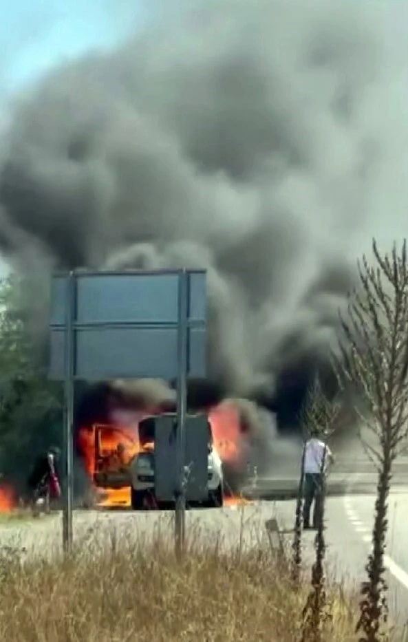 Sakarya’nın Kaynarca ilçesi D020 kara yolunda pikap tarzı bir araç alevlere teslim oldu.