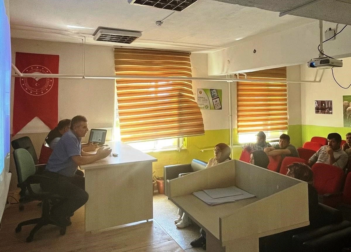 İlçe Tarım ve Orman Müdürlüğünde tarım ve hayvancılık sektörlerinin gelişmesi ve nitelikli üretici sayısının artırılması amacıyla açılan besi sığırı yetiştiriciliği kursunda kursiyerlere, İlçe Tarım Müdürü Yusuf Başan, Ziraat Mühendisi İsmail Ersen Atlı ve Veteriner Hekim Süleyman Mavi tarafından daha iyi, sürdürülebilir, bilinçli hayvancılık yapmalarını ve karşılaşmış oldukları sorunlarda nasıl yol izleyecekleri konularında bilgi veriliyor.