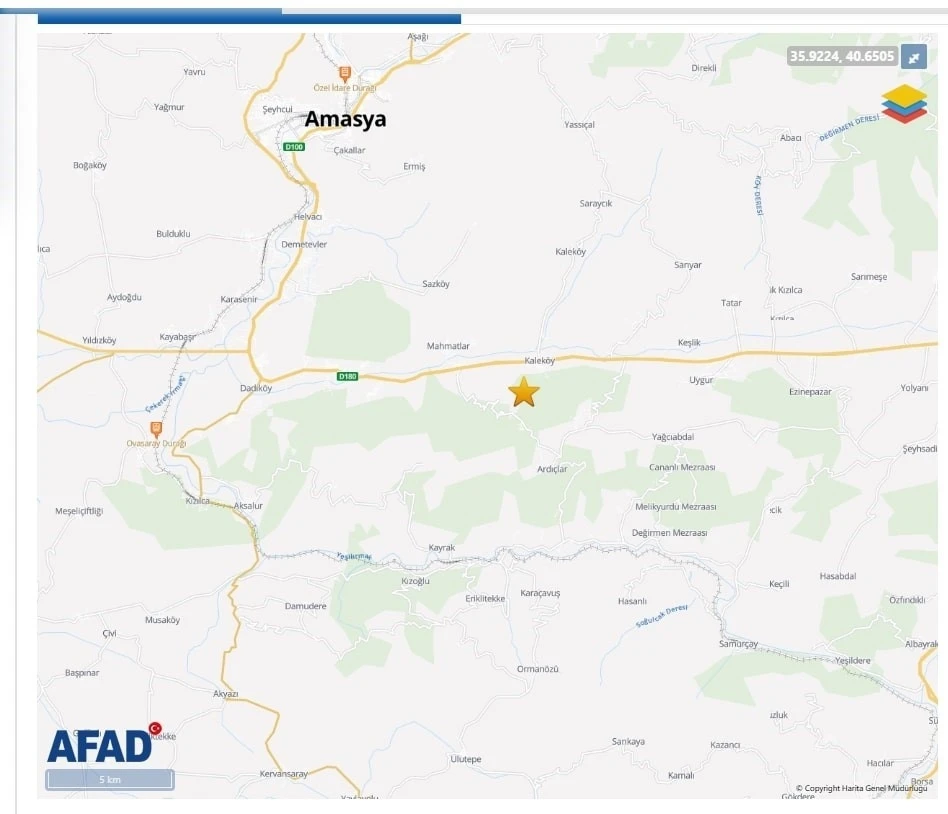 Afet ve Acil Durum Yönetimi Başkanlığı (AFAD) verilerine göre, bugün saat 13.17’de merkez üssü Amasya Merkez olan 3.2 büyüklüğünde bir deprem kaydedildi. Depremin yerin 7.02 kilometre derinliğinde meydana geldiği bildirildi.