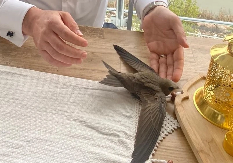 Bütün ömrünü uçarak geçirmesiyle bilinen ebabil kuşunu balkonunda gören Galip Uzun, uçamayacak durumda olan misafirini bir süre beslemeye çalıştı.