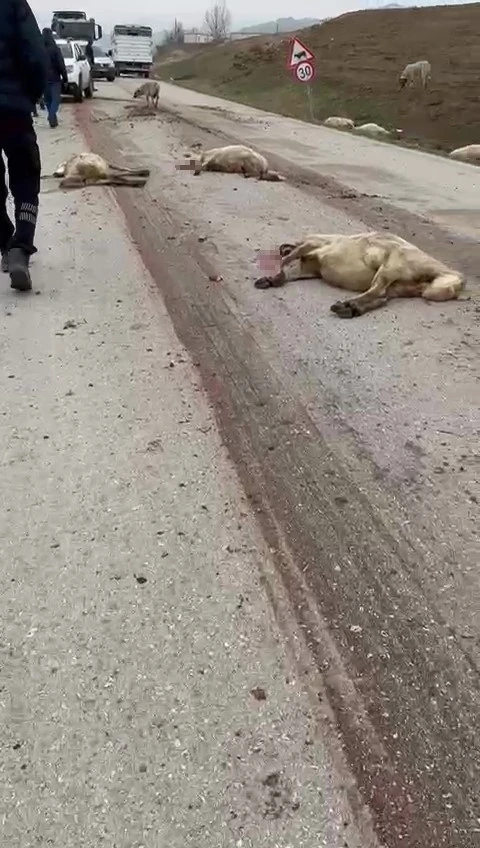 Amasya’nın Suluova ilçesinde freni patlayan kamyon koyun sürüsüne daldı, ezilen 17 koyun telef oldu.