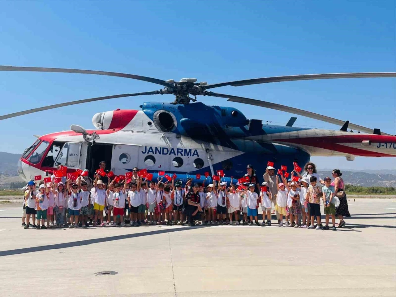 Aydın’da Filo Komutanlığı’nı ziyaret eden anaokulu öğrencileri, hem jandarmayı daha yakından tanıdı, hem de helikopterleri görerek unutulmaz bir gün geçirdi. Aydın İl Jandarma Komutanlığı Aile içi Şiddetle Mücadele ve Çocuk Kısım Amirliği koordinesinde öğrencilere yönelik bilgilendirme tanıtım faaliyetleri aralıksız devam ediyor. Bu çerçevede Efeler Kübra Efe Anaokulu öğrencileri Aydın İl Jandarma Komutanlığı ve Aydın Jandarma Helikopter Filo Komutanlığı’nı ziyaret etti. "Evinize Hoş geldiniz" faaliyeti kapsamında minik öğrencileri ağırlayan ekipler, öğrencilere jandarma hakkında tanıtıcı bilgiler verdi. Jandarmayı daha yakından tanıma fırsatı bulan minikler ise bir yandan da helikopterleri gezerek unutulmaz bir gün geçirdi. Etkinlik sonunda öğrencilere, balon ve şanlı Türk bayrağı hediye edildi.