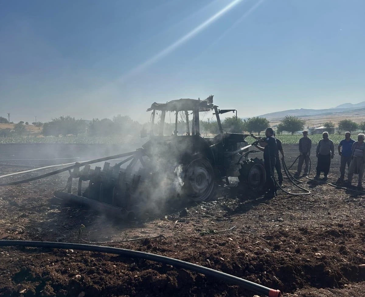 Adıyaman’da, meydana gelen anız yangınına müdahale etmek isteyen bir traktör yanarak hurdaya döndü.