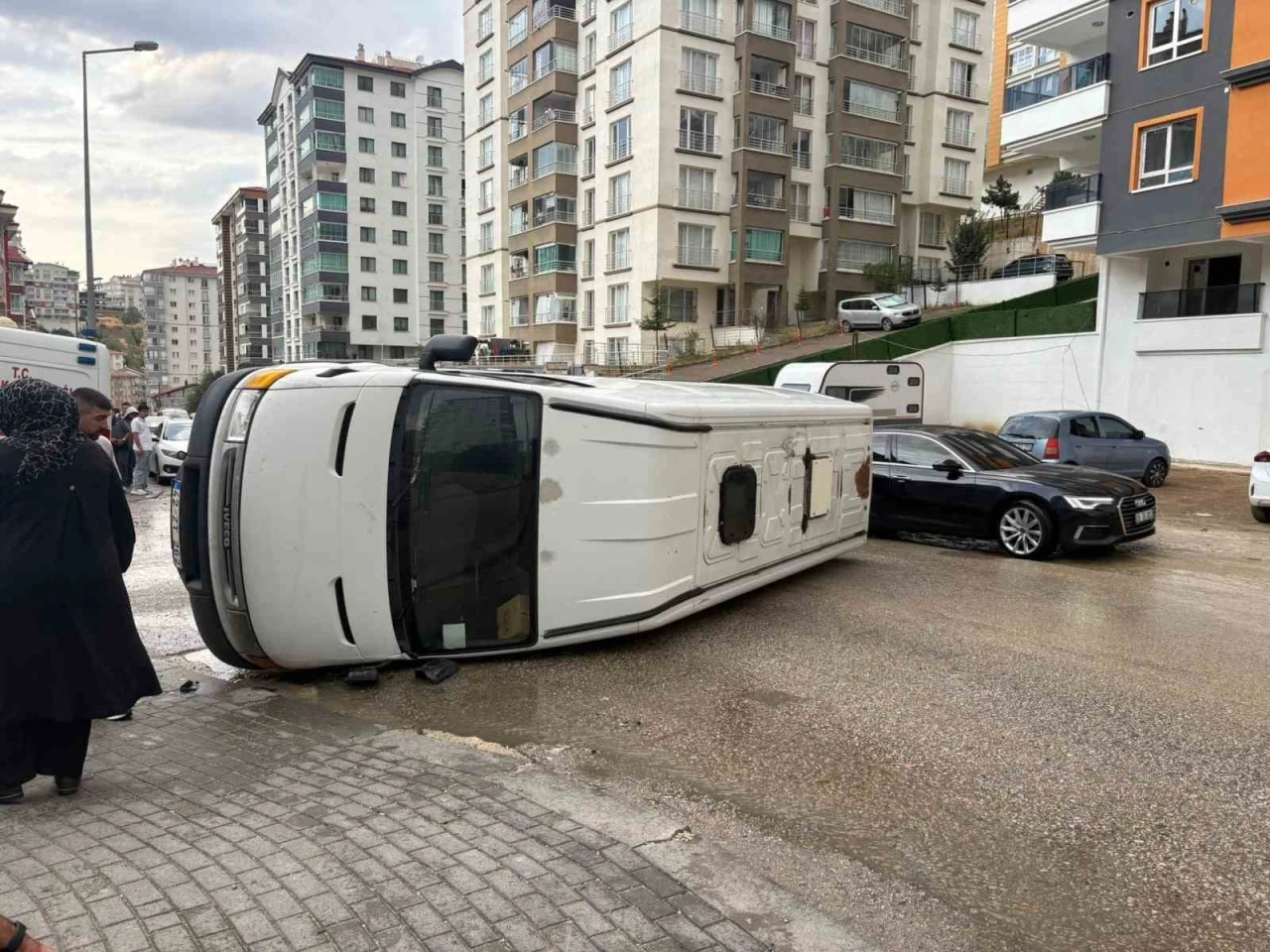 Ankara’nın Mamak ilçesinde yağmur nedeniyle kayganlaşan yolda kontroldan çıkan minibüs, yol kenarına devrildi. Sürücü kazayı hafif sıyrıklarla atlattı.