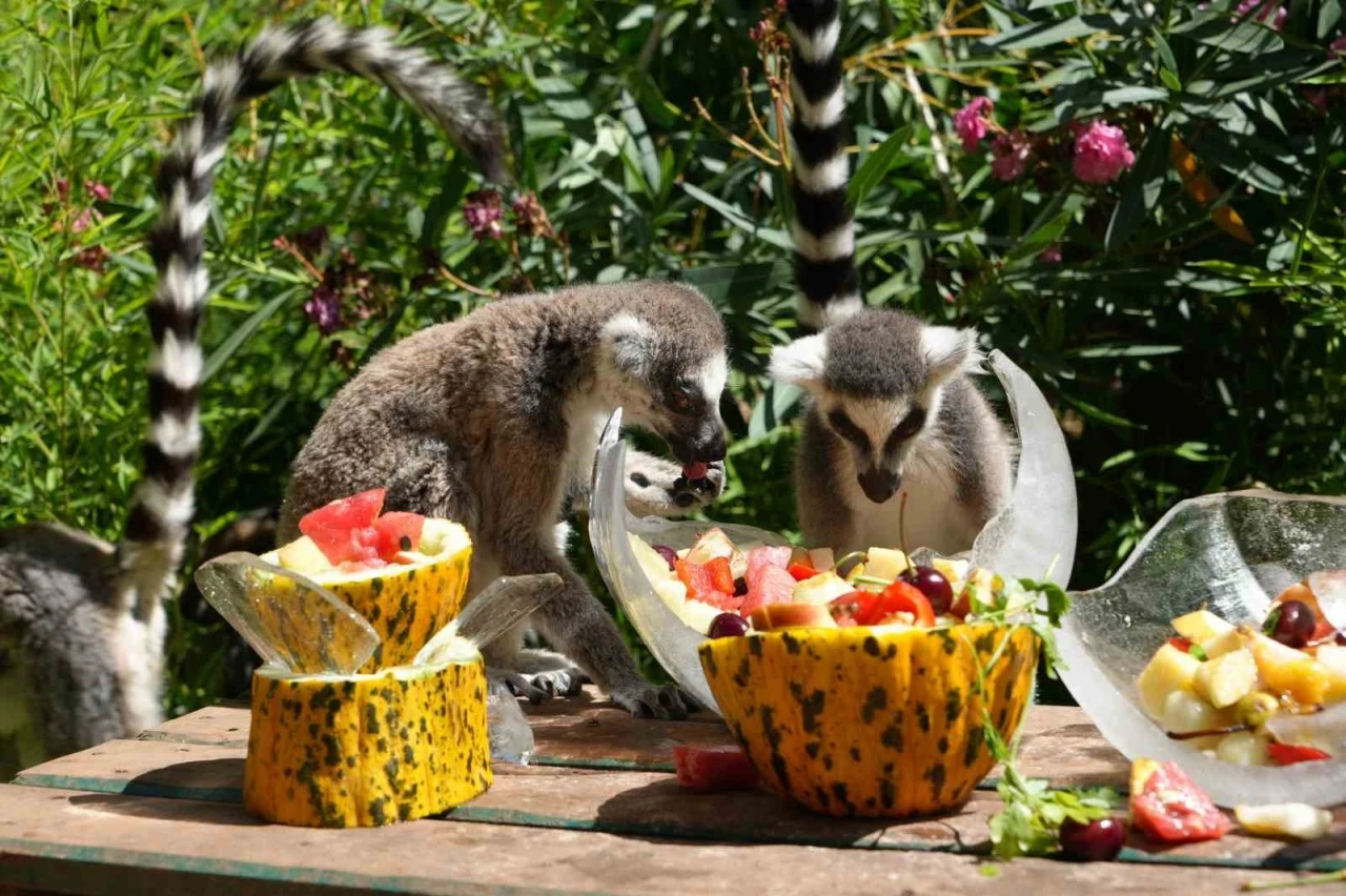 Park çalışanları, sıcaklardan etkilenen hayvanlar için buz kalıpları içerisinde meyve ve sebzelerden oluşan karışımlar hazırlıyor. Bozayı, lemur ve maymunlar, karpuz, muz, elma, portakal ve kiraz gibi meyvelerden oluşan buzlu kokteyli keyifle tüketirken bu anlar ziyaretçilerin de ilgisini çekiyor.