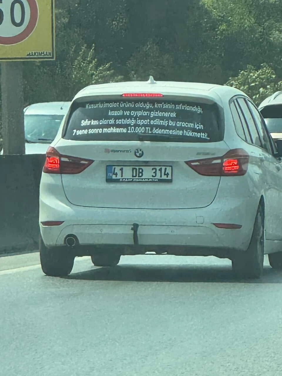 Kocaeli’de sıfır kilometre diye satın aldığı BMW marka aracın kazalı olduğunu öğrenen sürücü, konuyu mahkemeye taşıdı. 7 yıl süren sürecin ardından aracın kusurlu olduğu mahkeme tarafından belirlenirken, sahibine 10 bin TL tazminat ödenmesine hükmedildi. Araç sahibi ise BMW’den intikamını, otomobilin arkasına yazı yazarak aldı. Aracın arka camında yer alan ve sürücünün başından geçenleri özetleyen yazıda şu ifadeler yer aldı: