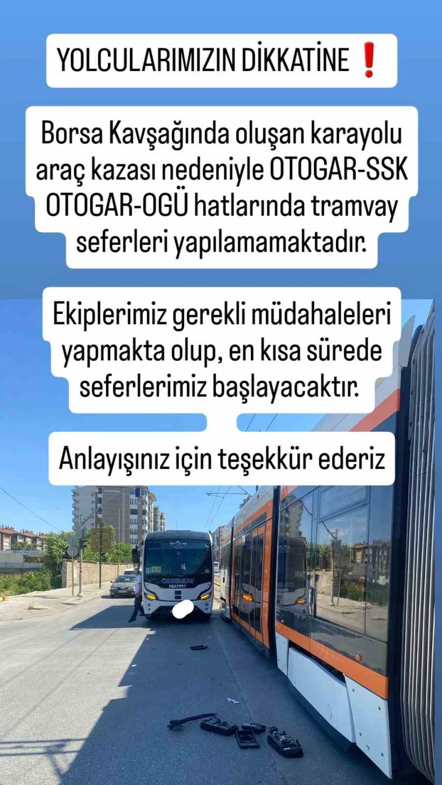 ESTRAM tarafından konuyla ilgili yapılan ilk açıklamada, "Borsa Kavşağı’nda oluşan karayolu araç kazası nedeniyle OTOGAR-SSK, OTOGAR-OGÜ hatlarında tramvay seferleri yapılamamaktadır. Ekiplerimiz gerekli müdahalelileri yapmakta olup, en kısa sürede seferlerimiz başlayacaktır. Anlayışınız için teşekkür ederiz" diye belirtilmişti.