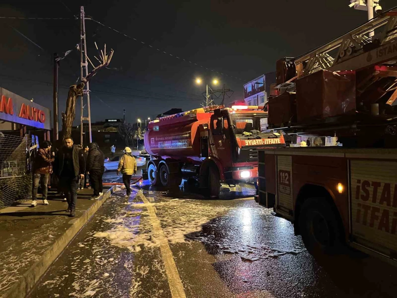 İstanbul Arnavutköy’de oto tamirhanesi olarak kullanılan iş yerinde yangın çıktı. Yangın itfaiye ekiplerince söndürülürken, alevler cep telefonu kamerasına anbean yansıdı.