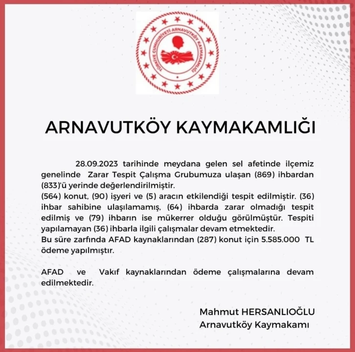 Edinilen bilgiye göre, Arnavutköy Kaymakamlığı 28 Eylül tarihinde meydana gelen sel nedeniyle ilçe genelinde Zarar Tespit Çalışma Grubu’na gelen 869 ihbardan 833’ünü yerinde değerlendirdi. Ekipler tarafından 564 konutun, 90 işyerinin ve 5 aracın selden etkilendiği tespit edilirken, 36 ihbar sahibine ulaşılamadı. 64 ihbar da zarar olmadığını belirleyen ekipler, 79 ihbarın ise farklı vatandaşlar tarafından iletilen aynı ihbarlar olduğunu kaydetti. Zarar Tespit Çalışma Grubu görevlileri 36 ihbar için çalışmalarını sürdürüyor. Bu süre zarfında AFAD kaynaklarından 287 konut için 5 milyon 585 bin lira ödeme yapıldığı bildirildi. AFAD ve vakıf kaynaklarından ödeme çalışmalarının devam ettiği duyuruldu.