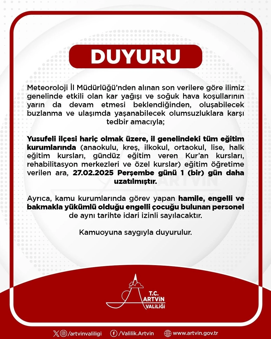 Açıklamaya göre, Yusufeli ilçesi hariç olmak üzere, il genelindeki tüm eğitim kurumlarında (anaokulu, kreş, ilkokul, ortaokul, lise, halk eğitim kursları, gündüz eğitim veren Kur’an kursları, rehabilitasyon merkezleri ve özel kurslar) 27 Şubat Perşembe günü de eğitim yapılmayacak. Kamu kurumlarında görev yapan hamile, engelli ve bakmakla yükümlü olduğu engelli çocuğu bulunan personelin de aynı tarihte idari izinli sayılacağı bildirildi.