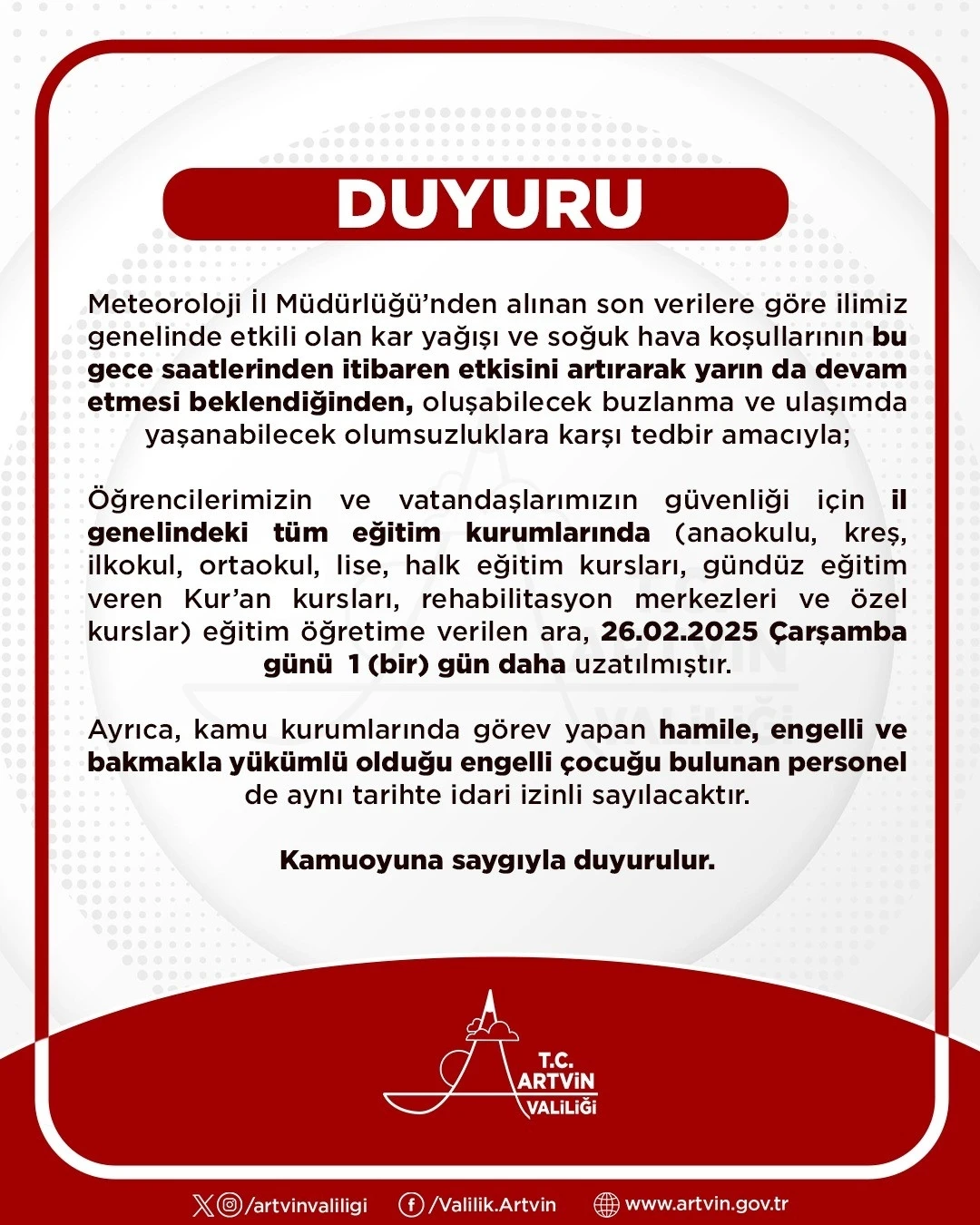 Artvin il sınırları içindeki tüm eğitim kurumlarında (anaokulu, kreş, ilkokul, ortaokul, lise, halk eğitim kursları ve özel eğitim kurumları) 26 Şubat’ta da eğitim faaliyetlerinin yapılmayacağı açıklandı. Ayrıca, kamu kurumlarında çalışan hamile, engelli ve bakmakla yükümlü olduğu engelli çocuğu bulunan personel de idari izinli sayılacak.