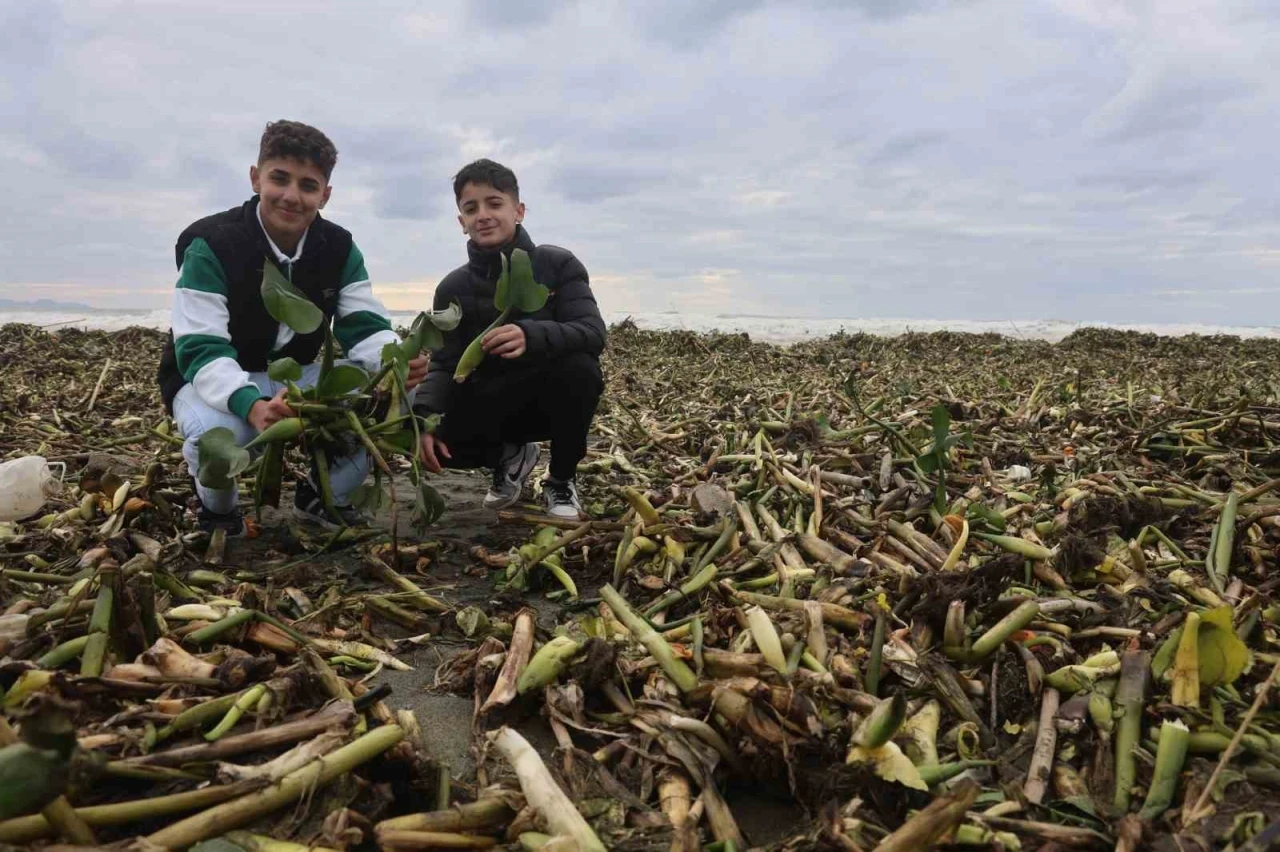 Hatay’da yaz aylarında Asi Nehrin kaplayan istilacı su sümbülleri, kentte etkili olan şiddetli fırtına ve yağışla birlikte Akdeniz’e döküldü. Denizdeki dalgaların kıyıya vurduğu su sümbülleri, Samandağ sahilini yeşile büründü.