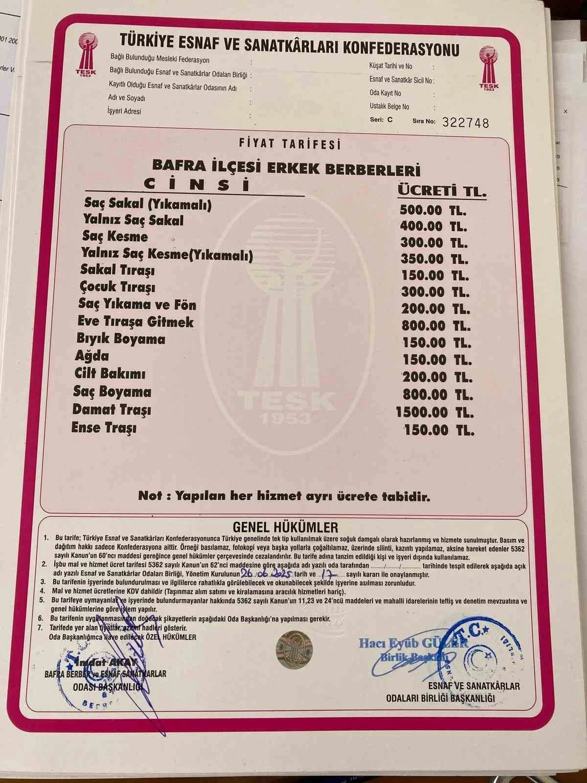 Yapılan açıklamada, ekonomik koşullar ve giderlerdeki artış nedeniyle tarifede güncellemeye gidildiği belirtilerek, vatandaşların yeni fiyatlar konusunda bilgilendirileceği ifade edildi. Zamlı tarifelerin tüm berber ve kuaför salonlarında görünür şekilde asılması zorunlu olacak.
