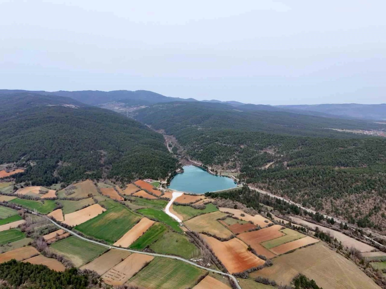 Kastamonu’da baharın gelmesiyle ayrı bir güzelliğe bürünen gölet, köy ve ormanlar havadan görüntülendi.