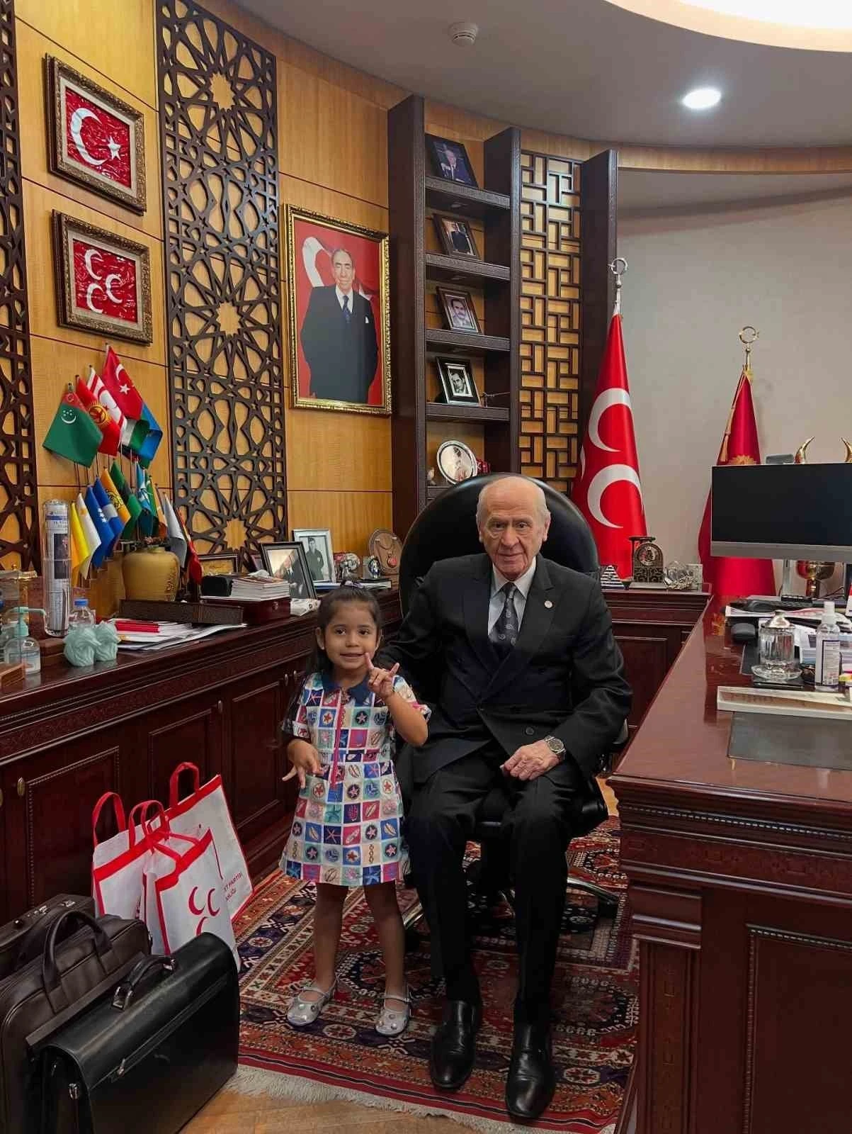 Aylardır ’Devlet Dede’ diye hitap ettiği MHP Genel Başkanı Devlet Bahçeli’nin elini öpmek istediğini belirten 3,5 yaşındaki Hilal Pehlivan, Aydın’dan Ankara’ya götürülerek MHP Lideri Devlet Bahçeli’nin elini öperek Bozkurt Selamı verdi. Kızlarının en büyük isteğini gerçekleştirebilmenin mutluluğunu yaşayan Gizem-Burak Pehlivan Çifti, "Kızlarının en büyük hayalini gerçekleştirdiği için Devlet Bahçeli’ye teşekkür ettiler.