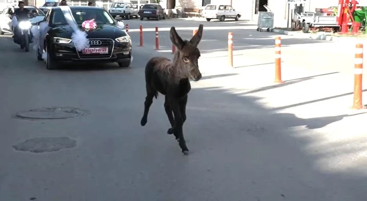 Kütahya’da düğün konvoyuna katılan sıpa, ilginç görüntülere sahne oldu.