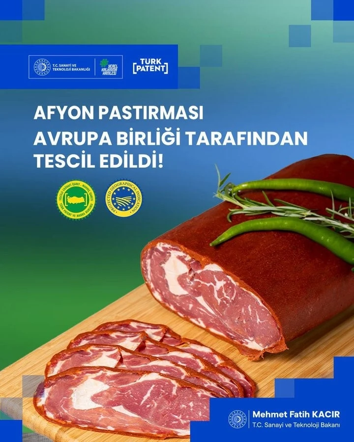 Sanayi ve Teknoloji Bakanı Mehmet Fatih Kacır, "Uluslararası coğrafi işaret tescillerimize bir yenisini ekledik. Afyon Pastırması, Avrupa Birliği’nde tescillenen 34’üncü coğrafi işaretli ürünümüz oldu" dedi.