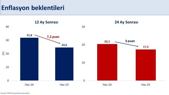 "Dezenflasyon sürecinde kritik öneme sahip enflasyon beklentilerindeki iyileşme devam ediyor. Piyasa katılımcılarının 12 ay sonrası yıllık enflasyon beklentisi haziranda geçen yılın aynı ayına göre 7,2 puan gerileyerek yüzde 24,6 oldu. Uyguladığımız bütüncül politikaların sonucu olan beklentilerdeki bu iyileşmenin sürmesi çok önemlidir. Programı kararlılıkla uygulamaya devam edeceğiz."