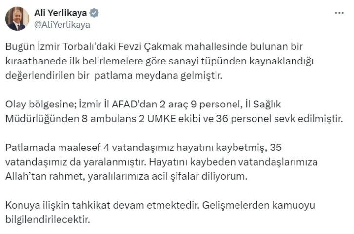 İçişleri Bakanı Ali Yerlikaya, İzmir’in Torbalı ilçesine bağlı Fevzi Çakmak Mahallesi’nde yaşanan patlamaya ilişkin sosyal medya hesabından açıklamada bulundu. Yerlikaya paylaşımında, "Bugün İzmir Torbalı’daki Fevzi Çakmak Mahallesi’nde bulunan bir kıraathanede ilk belirlemelere göre sanayi tüpünden kaynaklandığı değerlendirilen bir patlama meydana gelmiştir. Olay bölgesine; İzmir İl AFAD’dan 2 araç 9 personel, İl Sağlık Müdürlüğünden 8 ambulans, 2 UMKE ekibi ve 36 personel sevk edilmiştir. Patlamada maalesef 4 vatandaşımız hayatını kaybetmiş, 35 vatandaşımız da yaralanmıştır. Hayatını kaybeden vatandaşlarımıza Allah’tan rahmet, yaralılarımıza acil şifalar diliyorum. Konuya ilişkin tahkikat devam etmektedir. Gelişmelerden kamuoyu bilgilendirilecektir" ifadelerine yer verdi.