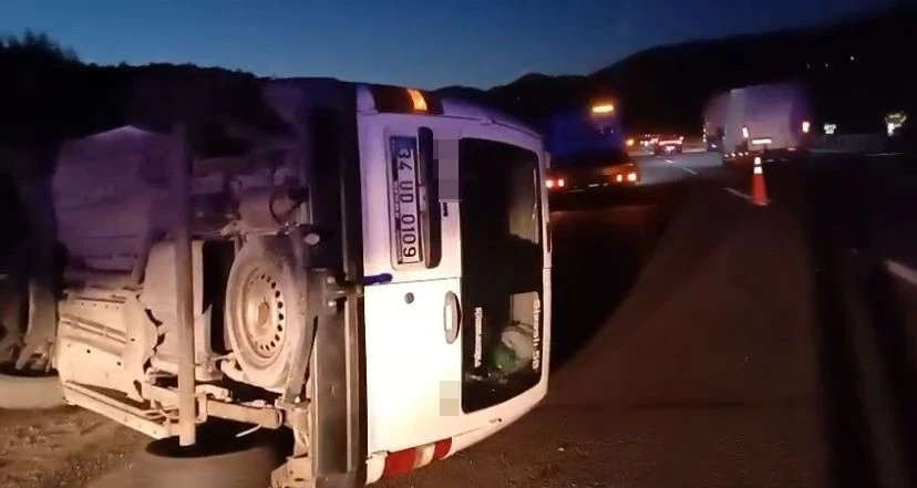 Bolu TEM Otoyolu’nda kontrolden çıkan hafif ticari araç, bariyerlere çarparak yan yattı. Sürücü kazayı yara almadan atlattı.
