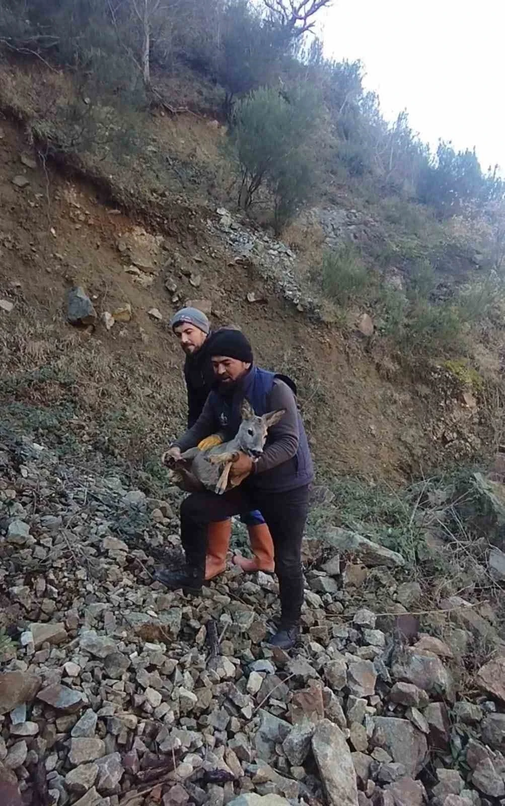 Gümüşhane’nin Kürtün ilçesinde yolunu kaybeden bir yetişkin dişi karaca köpeklerden kaçarken, Günyüzü Köyü’nde Gümüşhane-Giresun karayoluna yakın bir noktadaki alabalık tesisinin boş havuzuna düştü. Düştüğü havuzdan çıkamayan dişi karacanın sesini duyan tesis sahibinin oğlu Osman Selim Düzgün ise durumu babası Aydoğdu Düzgün’e bildirdi. Boş havuzun yanına gelen baba ve oğul yaralı karacayı düştüğü havuzdan çıkarmak için dakikalarca uğraştı. En sonunda havuz içerisindeki karacayı çıkaran ve yaralarına müdahale eden Aydoğdu Düzgün, daha sonra hayvanı doğaya saldı.