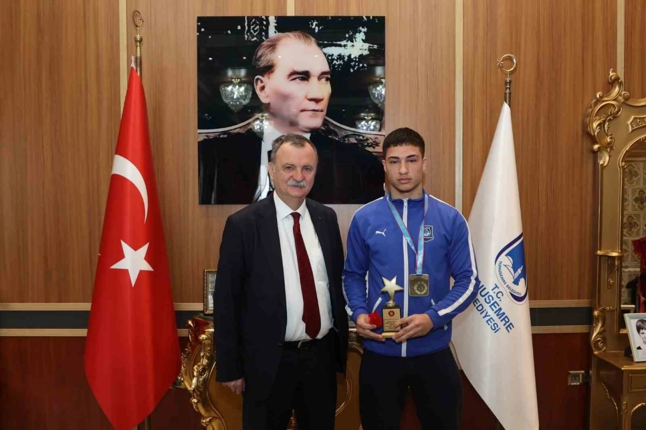 Yunusemre Belediye Başkanı Semih Balaban, Ankara’da düzenlenen Spor Toto Ümitler Türkiye Judo Şampiyonası’nda 73 kiloda şampiyon olan Yunusemre Belediyespor’un judocusu Emin Levent Yelkenci’yi tebrik ederek altınla ödüllendirdi.