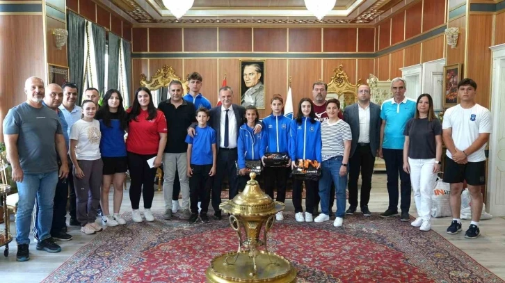 Yunusemre Belediyespor’un judo ve tekvandoda madalyalar kazanan milli sporcuları, Yunusemre Belediye Başkanı Semih Balaban’ı makamında ziyaret etti. Başkan Balaban, sporcuları başarılarından ötürü tebrik ederek ödüllendirdi. Elde edilen madalyalarda büyük emek ve özveri olduğunun altını çizen Başkan Balaban, Manisa ve Türkiye’yi en iyi şekilde temsil eden tüm ekiple gurur duyduklarını belirterek, "Sporcularımızı tebrik eder, emeği geçen antrenörlerimize ve ailelerimize teşekkür ederim. Yunusemre Belediyesi olarak hayallerini gerçeğe dönüştürmek için azimle çabalayan gençlerimizin daima yanında olacağız" diye konuştu. Judoda Irmak Ceylin Güçtekin Karadağ’da yapılan Ümitler Balkan Şampiyonası’nda şampiyon, Fulya Ergen ise Balkan 3.sü olurken, Uşak’ta düzenlenen Minikler Türkiye Judo Şampiyonası’nda Rabia Tekin ile Yağız Duman Türkiye 3.sü olarak ülkemizi Balkan Şampiyonası’nda temsil etmeye hak kazandı. Aytaç Aykut Gündoğan da Konya’da yapılan Ümitler Türkiye Judo Şampiyonası’nda bronz madalyanın sahibi oldu. Tekvandoda ise Alperen Aktaş Ankara’da yapılan Multi Avrupa Oyunları’nda gençlerde gümüş madalya elde ederek Ümitler Avrupa Şampiyonası’na katılmaya hak kazandı. Ayrıca milli sporculardan Selvinaz Küçükcankurtaran ve Gülcan Kinali de Multi Avrupa Oyunları’nda Türkiye’yi gururla temsil etti. Gülcan Kinali, bu yıl Antalya’da düzenlenen Turkish Open’da bronz, Nevşehir’de düzenlenen Okul Sporları Yıldızlar Türkiye Tekvando Birinciliği’nde altın madalyanın sahibi oldu. Ziyarete Kulüp Başkanı Bülent Kanik, yöneticiler İsmail Aydın, Engin Uzun, Enes Baysal, genel koordinatör Güliz Onater, judo antrenörleri Halil Atmaca, Derya Çidem, Orhan Akdemir, Mustafa Yeşil, tekvando antrenörü Serap Aydeniz de eşlik etti.