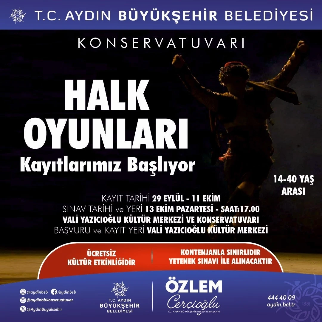Aydın Büyükşehir Belediyesi Konservatuvarı’nda ‘Halk Oyunları’ eğitimi için yeni dönem kayıtları başlıyor. Yıllardır Aydınlıların yoğun ilgi gösterdiği eğitimler bu yıl da 14-40 yaş arasındaki vatandaşlara açık olacak. Kontenjanla sınırlı olan programa başvurular, 29 Eylül - 11 Ekim tarihleri arasında Vali Yazıcıoğlu Kültür Merkezi’nde yapılabilecek. Öğrenci kabulü yetenek sınavı ile gerçekleştirilecek. Eğitimlere katılmaya hak kazanan kursiyerler, hem alanında uzman eğitmenlerden ders alacak hem de yıl boyunca düzenlenecek gösterilerde sahne alma fırsatı bulacak. Aydın Büyükşehir Belediye Başkanı Özlem Çerçioğlu, kültür ve sanat alanındaki çalışmaların devam edeceğini belirtti. Başkan Çerçioğlu, "Her yıl binlerce vatandaşımız konservatuvarımızın farklı branşlarında verilen eğitimlere katılıyor. Sanata duyulan bu ilgi bizleri daha çok motive ediyor. Tüm vatandaşlarımızı halk oyunları eğitimlerine kayıt yaptırmaya davet ediyorum" ifadelerini kullandı.