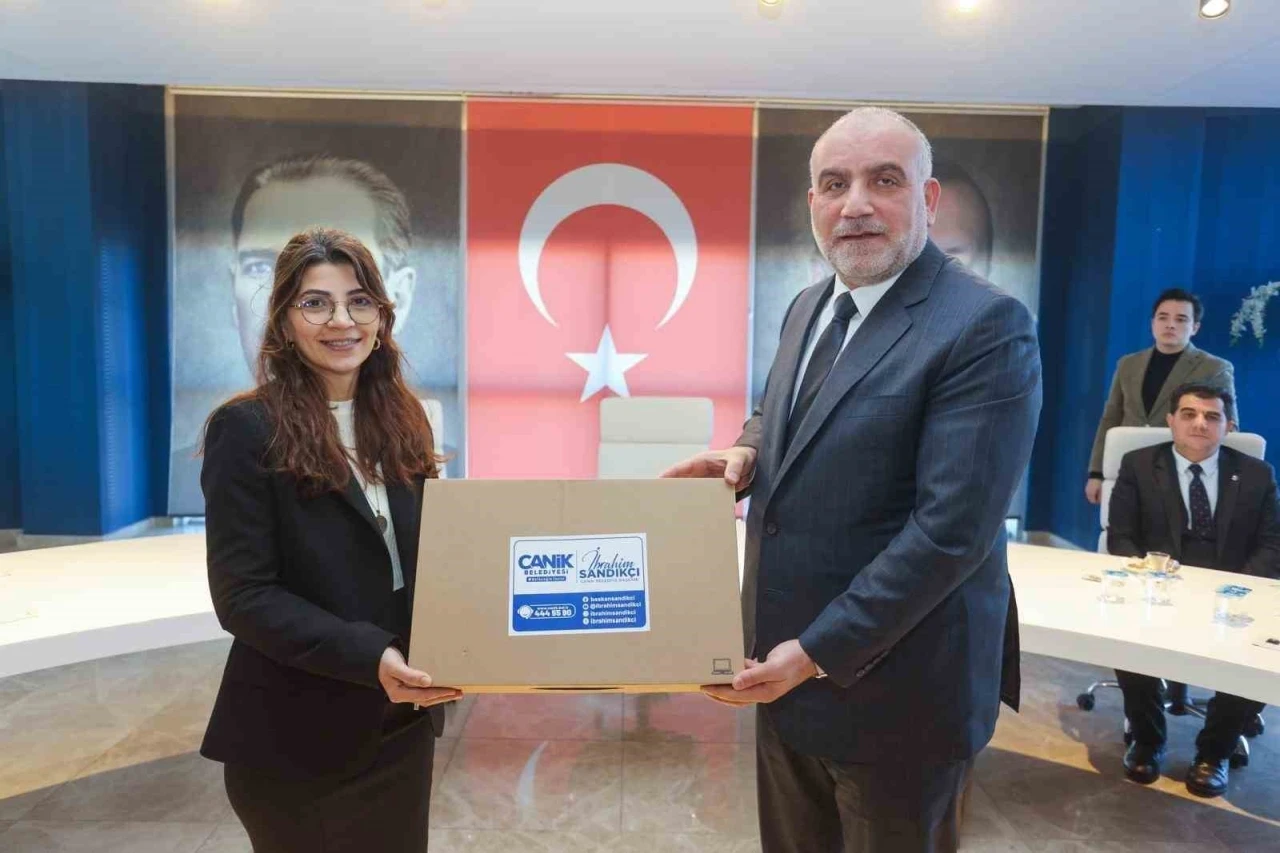 Başkan İbrahim Sandıkçı, toplantının ardından öğretmenlere dizüstü bilgisayar hediye ederken öğretmenler, eğitime yönelik projeler ve desteklerden dolayı Başkan İbrahim Sandıkçı’ya teşekkür etti.