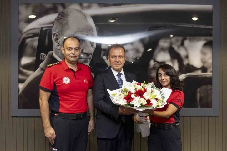 Şube müdürlerinin de yer aldığı ziyarette, itfaiye personeli Başkan Seçer’e çiçek takdim etti.